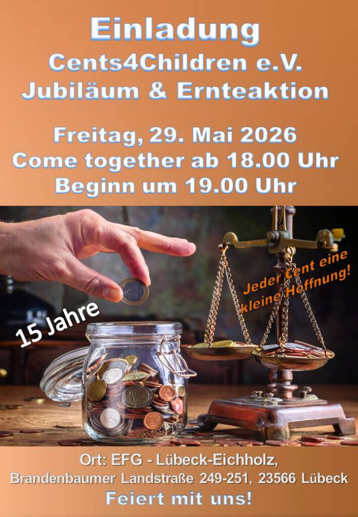 was im Jahr 2011 mit zwei einfachen Gläsern für Cent-Münzen begann, hat sich zu einer beeindruckenden Hilfswelle entwickelt. Am 29. Mai 2026 wollen wir das 15-jährige Bestehen von Cents4Children feiern und laden dazu alle Unterstützer & Interessierte zu einer besonderen Ernteaktion ein.